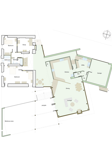 Within the sun trap formed to the south west, is a hard landscaped terrace with steps leading to a soft landscaped area, and a pergola which extends the building structure to the landscape.